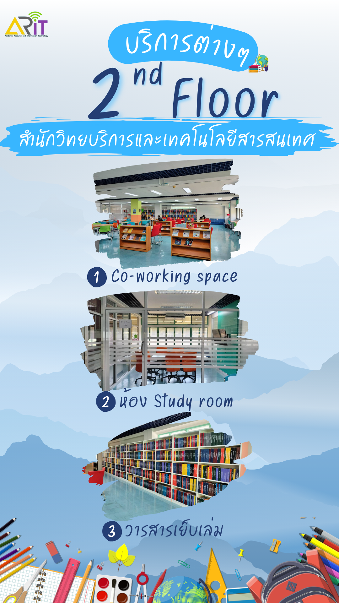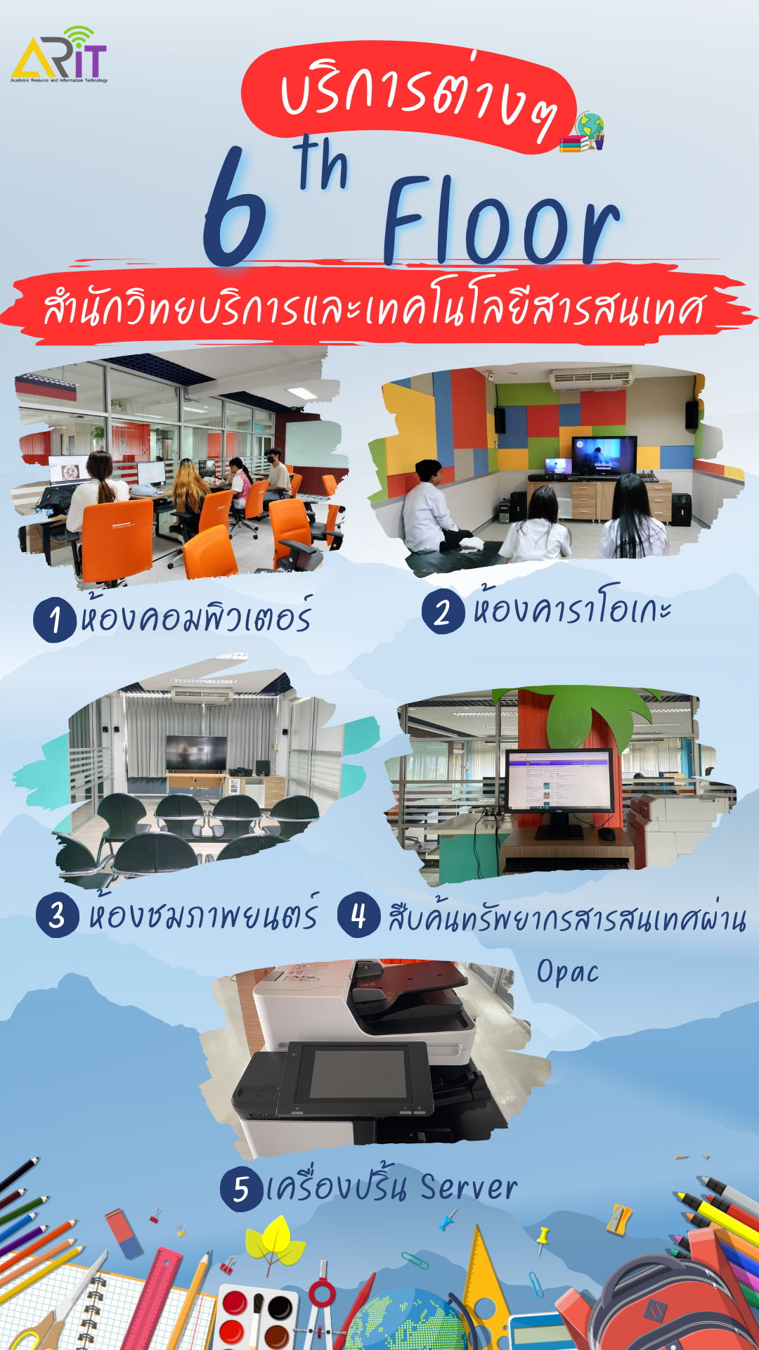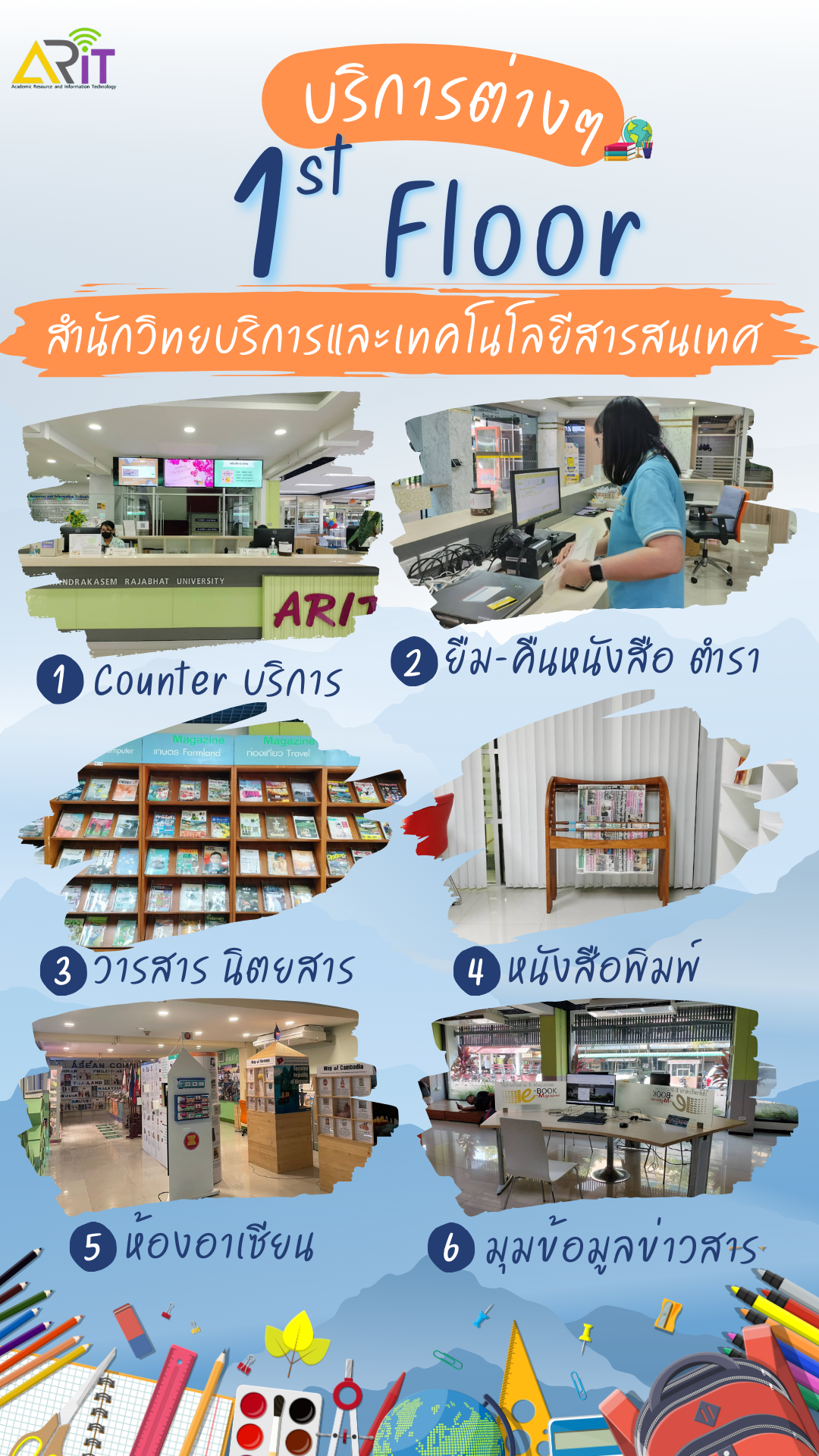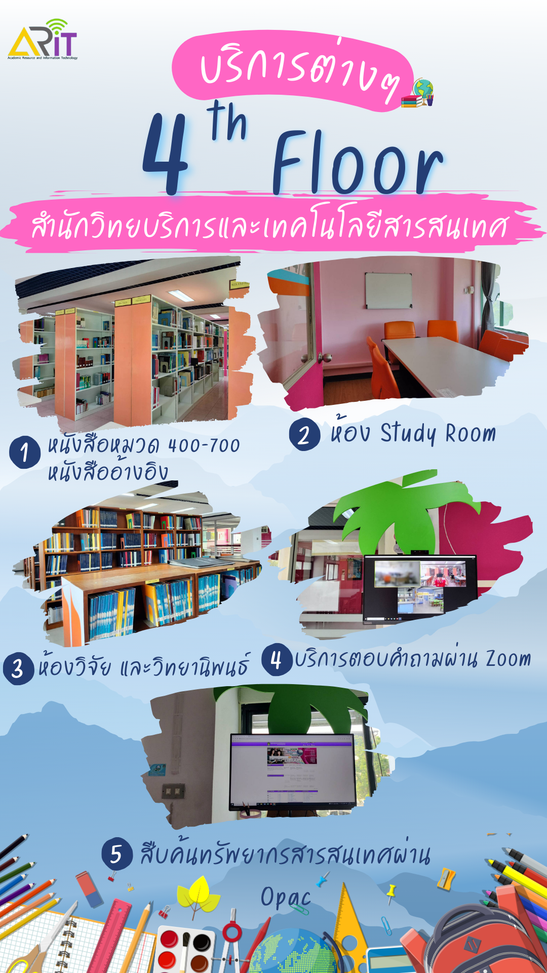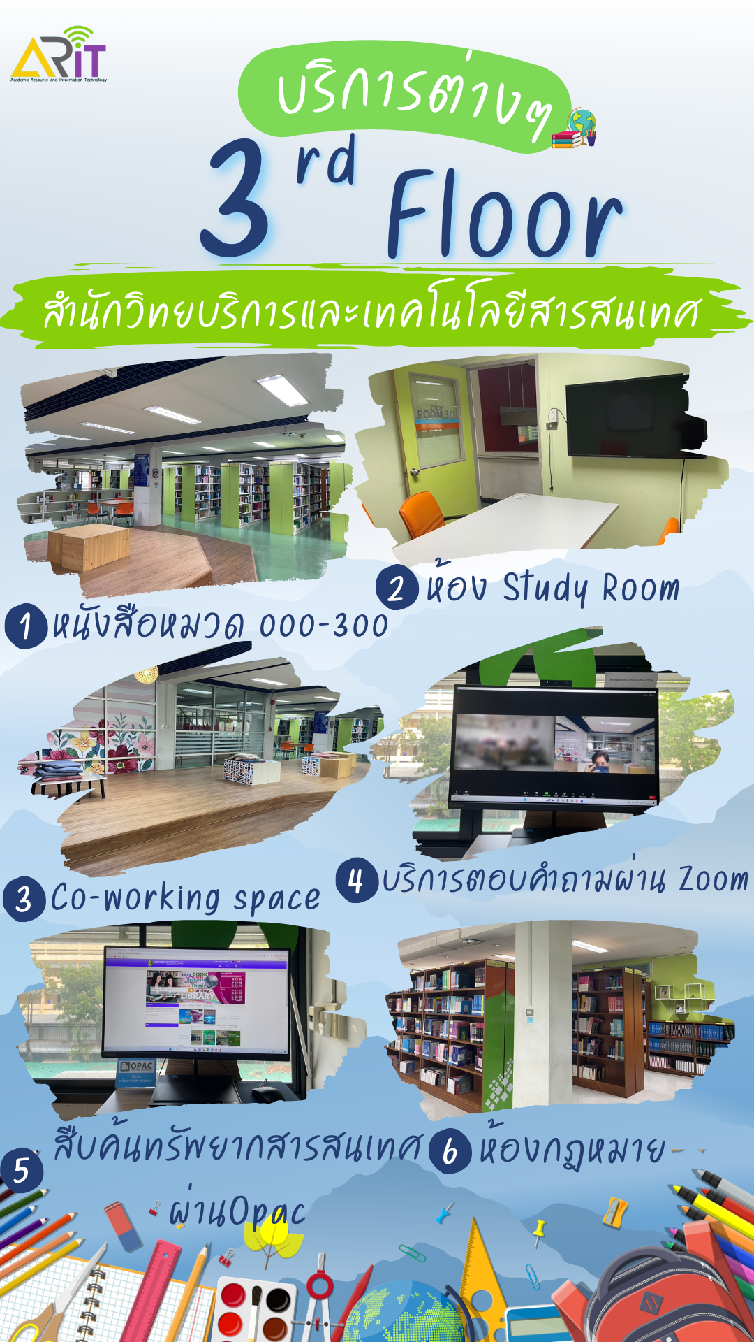 - บริการหนังสือทั่วไปหมวด 400-799 - หนังสือวิจัยและวิทยานิพนธ์ - เครื่องคอมพิวเตอร์เพื่อการสืบค้นฐานข้อมูลอิเล็กทรอนิกส์ - ห้องค้นคว้าเฉพาะบุคคล Study Room - มุมสถานีชาร์จไฟ - เครื่องคอมพิวเตอร์สืบค้นทรัพยากรสารสนเทศผ่านฐานข้อมูล OPAC |
