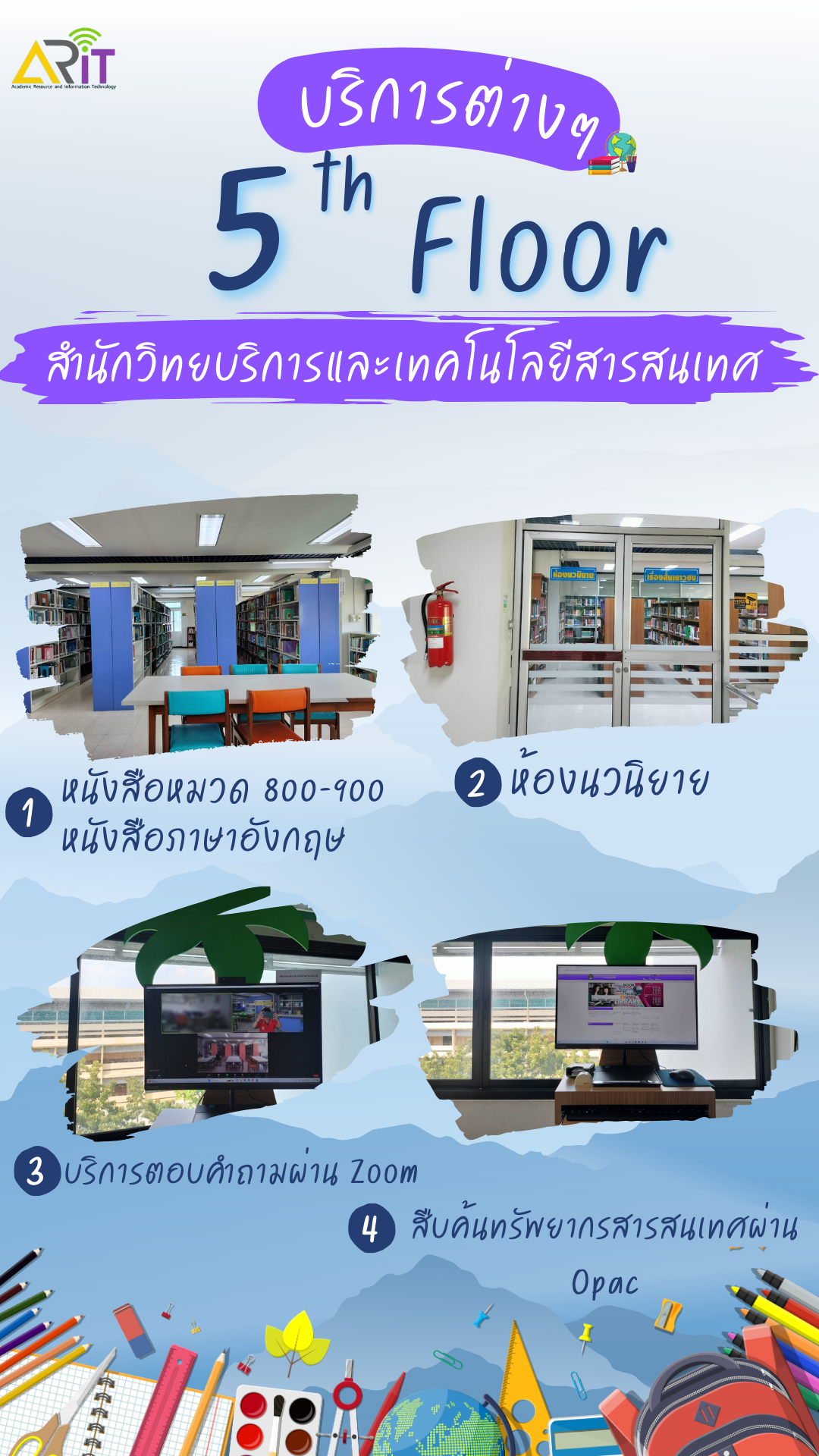 - บริการหนังสือทั่วไปหมวด 800-999 - หนังสือนิยาย/เรื่องสั้น - มุมเย็นศิระเพราะพระบริบาล รัชกาลที่ 9 - มุมสถานีชาร์จไฟ - เครื่องคอมพิวเตอร์สืบค้นทรัพยากรสารสนเทศผ่านฐานข้อมูล OPAC |